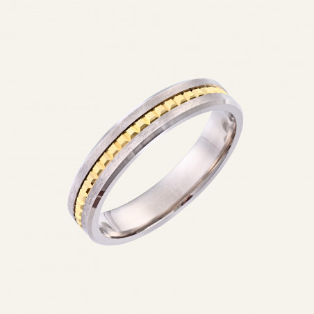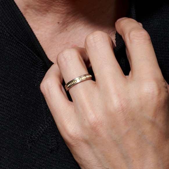 L'alliance Ulysse une ode à l'aventure. Les nuances chaudes de l'or jaune se mêlent harmonieusement aux reflets argenté de l'or blanc non-rhodié.