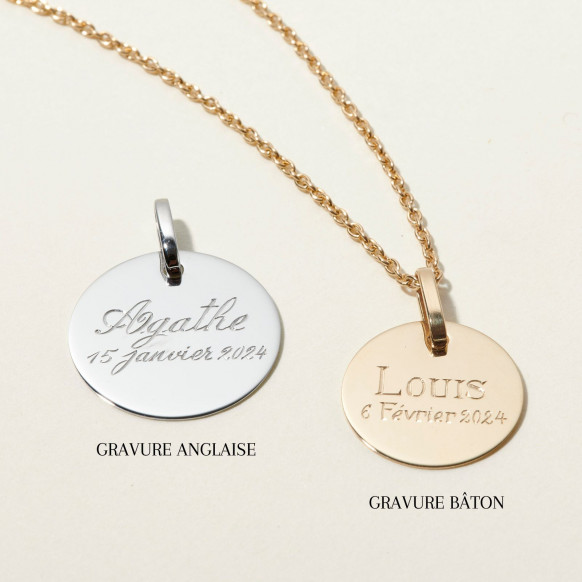 Cette médaille en forme de jeton est idéale pour accueillir la gravure d'un prénom ou une date pour faire un cadeau de naissance ou d'anniversaire personnalisé.